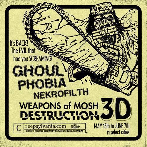 Not much is known about Ghoul as they are always seen wearing masks. The members go by the stage names Cremator, Fermentor, Digestor, and Dissector. The band has a large line-up of characters in their lyrics, including the four of themselves. Most of the information about them comes from the "Curio Shop Owner" one of the many characters mentioned in their songs. They claim to be mutants that came from Creepsylvania. Ghoul was signed after self-releasing a demo. Their musical style is best described as a blend of thrash and death metal with death metal vocals and lyrics.